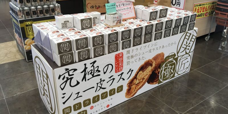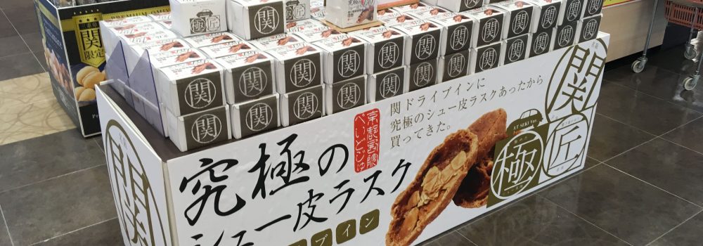 お土産販売エリアの売り場一画を総合的にプロデュース。 「究極のシュー皮ラスク」では関ドライブイン様のオリジナルデザインをご採用いただきました。